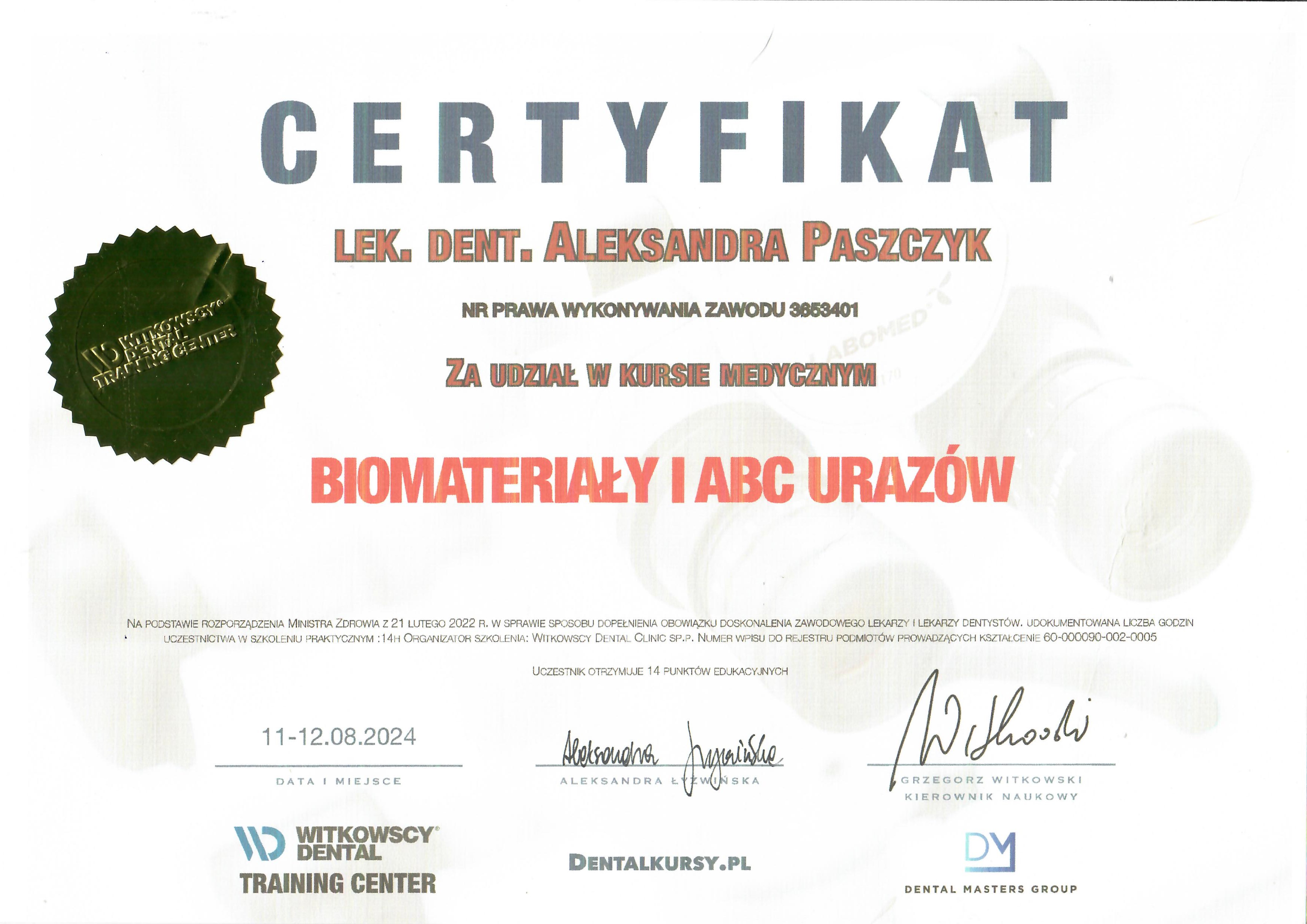 lek. stom. Aleksandra Paszczyk - Certyfikaty krajowe